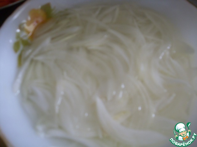 Вначале замаринуем наш лук. Для этого смешиваем ингредиенты для маринада: уксус, вода, сахар, соль. Именно эта пропорция мне пришлась по душе!!! Лук шинкуем тонкими полукольцами и заливаем маринадом. В идеале лук должен постоять в маринаде 1 час