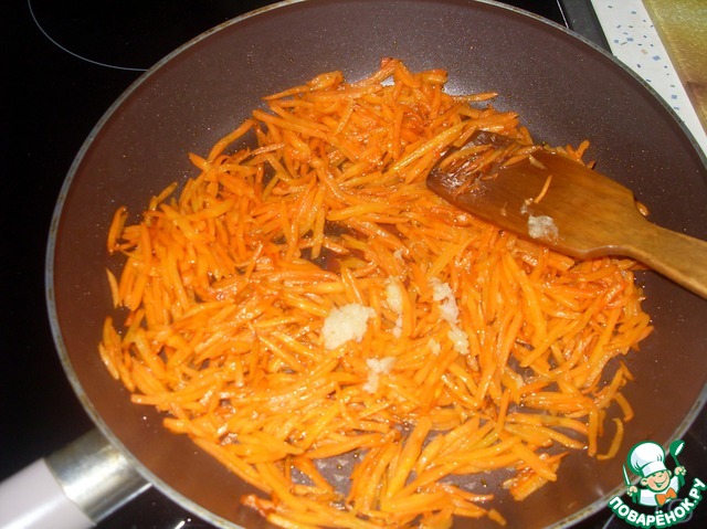 Морковь натираем на терке для корейской моркови. Можно просто на крупной терке и обжариваем в небольшом количестве растительного масла до мягкости, остужаем