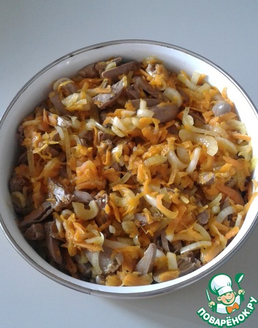 Лук выкладываем в дуршлаг, чтобы стек маринад. Можно даже слегка отжать его. Соединяем сердечки, морковь, маринованный лук