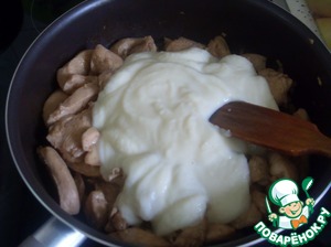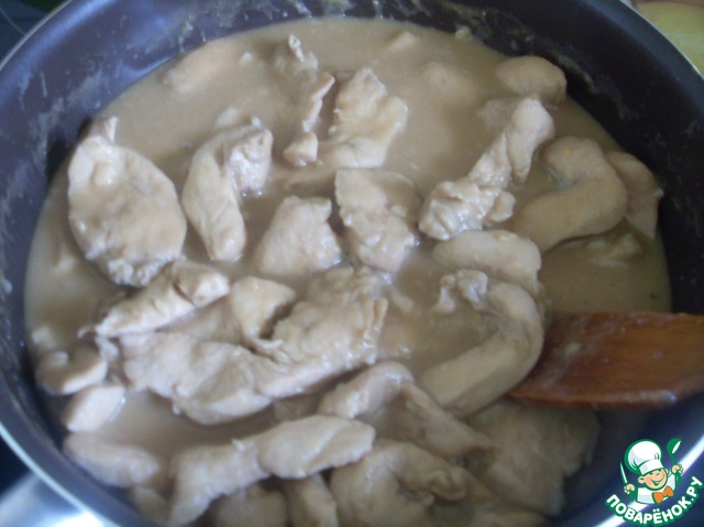 Прошло 10 минут. Отправляем мясо на раскаленную сковороду с небольшим количеством масла, быстро обжариваем до побеления. Снимаем с огня. Добавляем яблочное пюре, перемешиваем и возвращаем опять на огонь. Буквально несколько минут, помешивая, тушим грудку в подливке