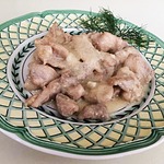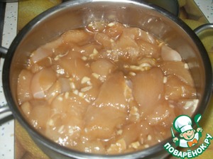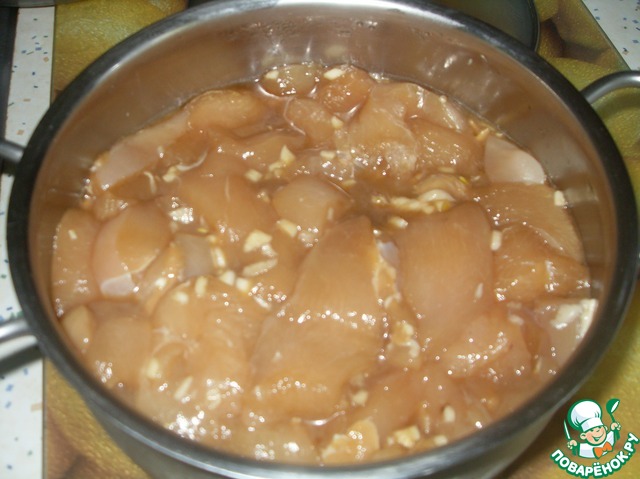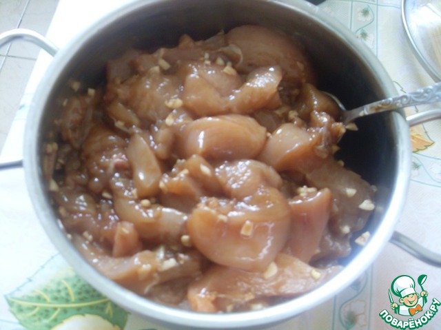 Грудку режем поперек волокон на кусочки (произвольно, но не мелко). Заливаем соевым соусом, добавляем уксус яблочный и рубленый чеснок. Оставляем мариноваться в холодильнике -