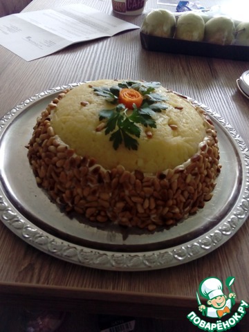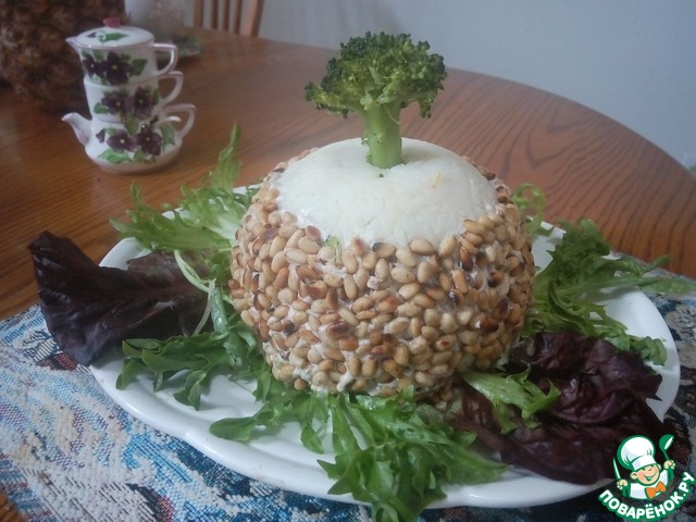 Посыпать нижнюю часть салата кедровыми орехами. -
