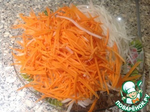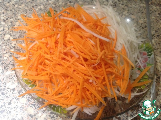 Пока мясо жариться, вода закипает, морковь и редьку натераем на терке для корейской моркови.