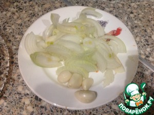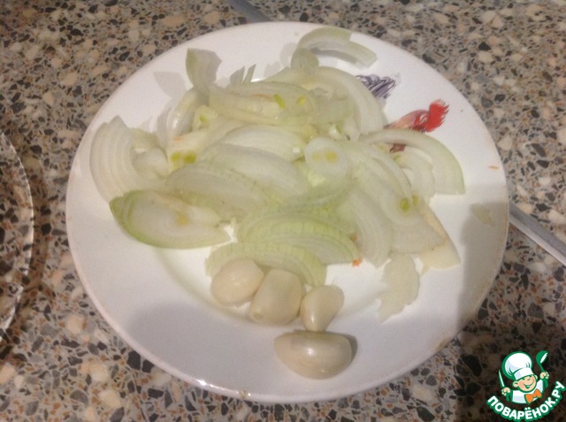 Лук нарезаем полукольцами. Чеснок пропускаем через пресс.