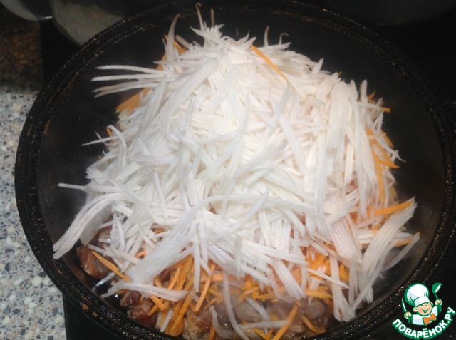 Мясо покрылось золотистой корочкой, солим (с учетом что будем добавлять соевый соус), добавляем к мясу лук, морковь и редьку. Жарим еще 4-5 минут, добавляем чеснок, соевый соус, красный и черный перец, перемешать и тушить еще минут 5. Кто любит сильно острое количество перца и чеснока можно увеличить.