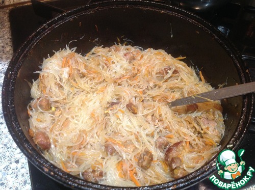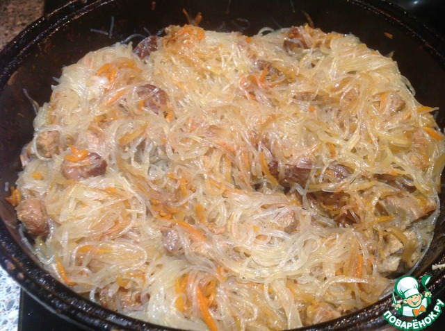 Фунчозу выкладываем в сковороду к готовому мясу и овощам, перемешиваем. Накрываем крышкой и даем постоять минут 5.