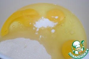 Яйца, сахар и ванилин взбить миксером.