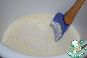 В несколько приемов, частями добавить муку к яично-сахарной смеси, каждый раз аккуратно перемешивая массу лопаткой движениями снизу вверх.