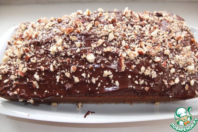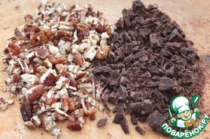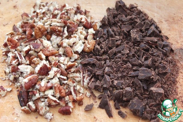 Добавляем какао, муку, шоколад, орехи. Немного орехов оставляем для посыпки.