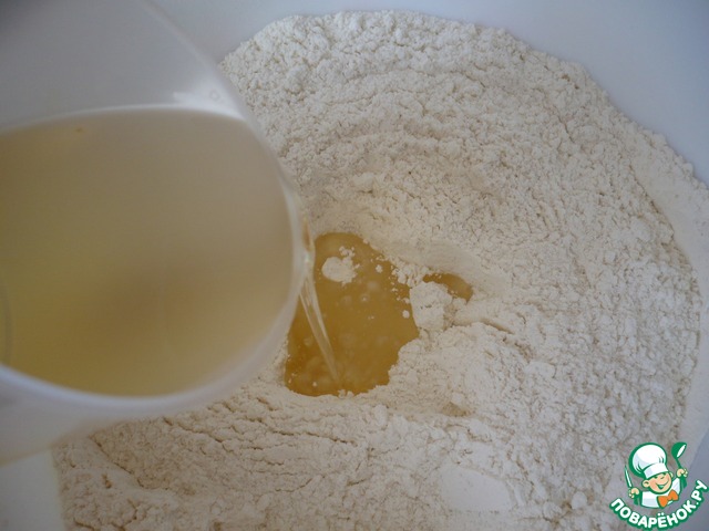 Теперь наливаем в муку теплую воду и начинаем замешивать тесто.