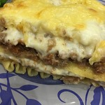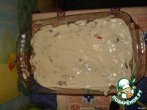 Накрыть листами лазаньи. Выложить оставшийся мясной соус. Смазать соусом Бешамель. Посыпать оставшимся сыром. Снова выложить листы. Смазать оставшимся соусом Бешамель.