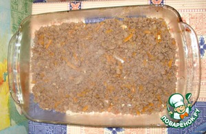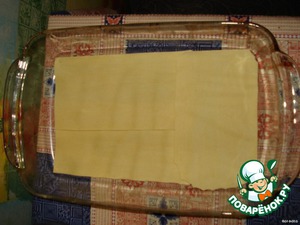 Сыр натереть на средней терке. В форму для запекания выложить листы лазаньи.