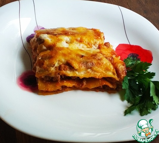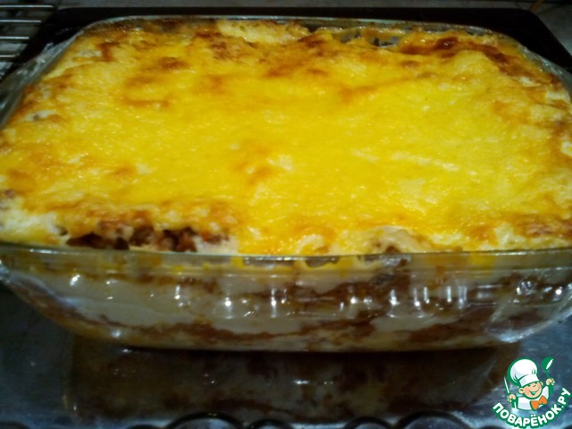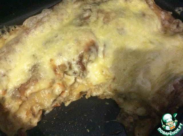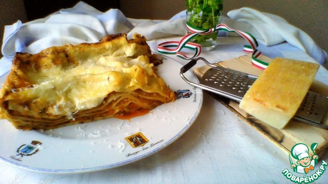 Поставить в духовку и запекать 40-45 минут при 180 градусах. Когда лазанья будет готова, посыпать ее тертым пармезаном и поставить в духовку еще на 5-10 минут.