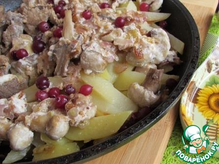 Клюкву не использовала при подаче,но вместо неё-майоран,он очень украсил блюдо своим вкусом,следующий раз использую его в процессе жарки картошки,будет ещё лучше.