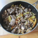 • В отдельной сковороде разогреть растительное масло и обжарить мясо до готовности, оно пожарится очень быстро.