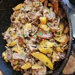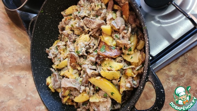 • К картофелю выложить соус и мясо, аккуратно перемешать, что бы не разламывались куски картофеля. Прикрыть сковороду крышкой и дать прогреться скоблянке на маленьком огне 5 минут. Довольно часто на последнем этапе скоблянку прогревают на порционных сковородках и подают прямо в них.