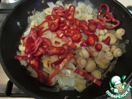 Добавить болгарский перец и потомить до появления аппетитного аромата. Поперчить, посолить и перемешать.