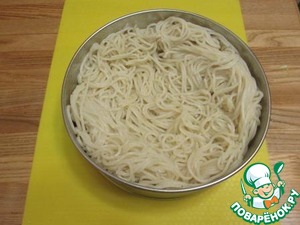 В разъёмную форму D 21 см. выложить теплые спагетти в виде гнезда. Хочу уточнить по поводу формы для выпечки - кольцо и дно иногда не плотно прилегают в разъёмной форме и она подтекает, если нет уверенности в её плотности, то лучше использовать цельную форму для выпечки.