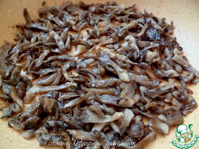 Грибы можно взять любые. У меня сегодня вешенки, но с шампиньонами нравится больше. Отварить их, нарезать соломкой, обжарить, остудить.