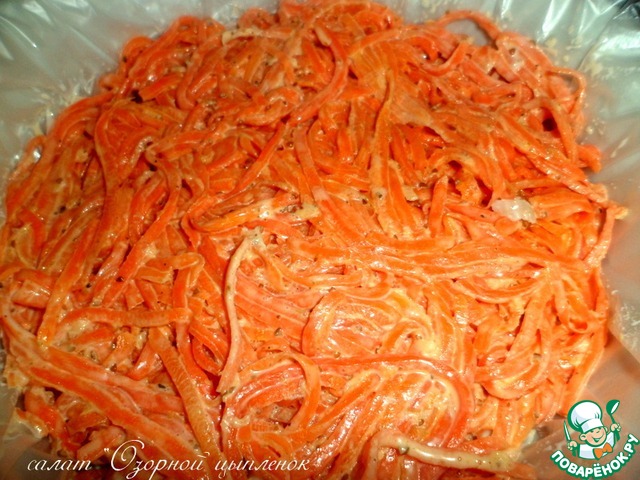 Готовую морковь по-корейски, так же смешать с небольшим количеством майонеза, уложить сверху.