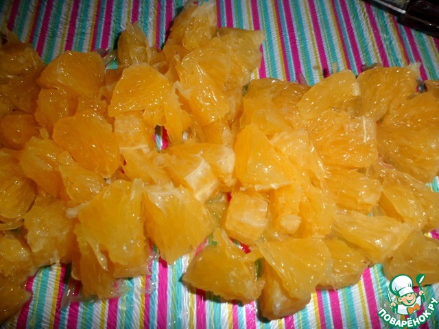 Апельсины почистить, разобрать на дольки. Нарезать на кубики.
