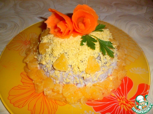 Знаю похожий салат ( без апельсина, и грибы не жаренные а маринованные) под названием " драная курица " - там фишка в том что куриную грудку не режут а руками раздирают на волокна. Безумно вкусно, делаю на все праздники.