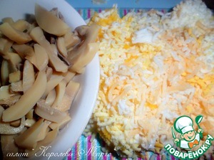 Грибы, у меня шампиньоны, нарезать кусочками. Яйца натереть на средней терке.
