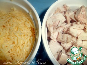Сыр натереть на средней терке, куриное мясо нарезать кусочками.