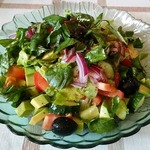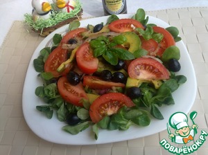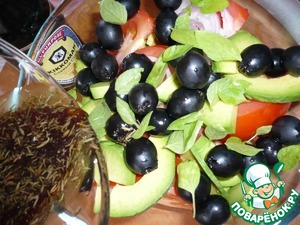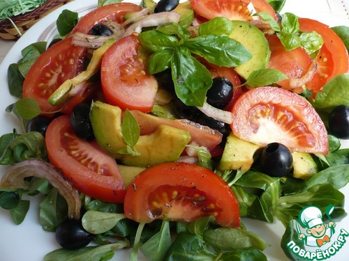Добавить свежий базилик и маслины. Заправить салат приготовленной заправкой. Все хорошо перемешать.