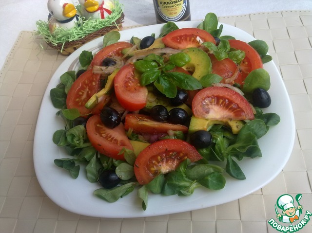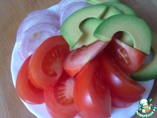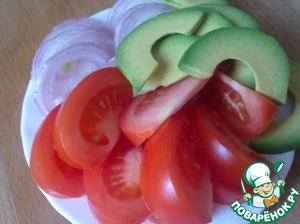 Помидоры порезать дольками. Авокадо разрезать напополам, вытащить косточку, почистить и нарезать ломтиками. Красный лук нарезаем тонкими полукольцами.