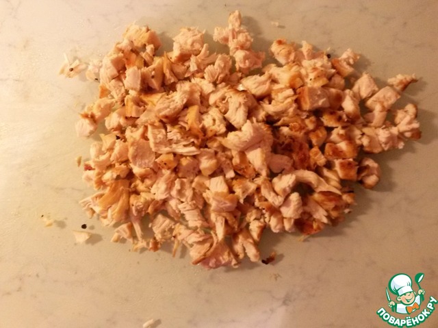Куриное филе обжариваем на оливковом масле с обеих сторон, слегка присолить, поперчить, можно запечь в духовке, предварительно завернув в фольгу.