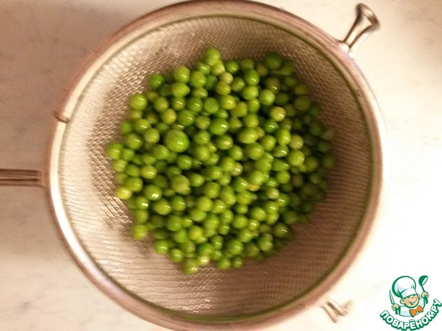 Замороженный горошек заливаем кипятком на пару секунд и промываем холодной водой, откидываем на сито, чтобы стекла вода.