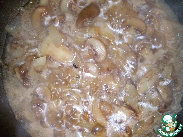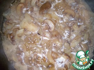 К обжаренному луку выкладываем грибы и жарим до тех пор пока жидкость не выпарится. Клажем кусочек сливочного масла. Снимаем сковороду, даем маслу растаить и выкладываем грибочки на мясо. -