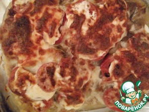 Свиная корейка, запеченная под шапкой грибов и помидоров.