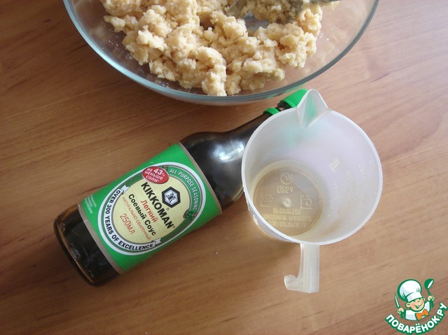 Соевый соус соединяем с маслом и выливаем в горохово-пшённое пюре. Тщательно перемешиваем.