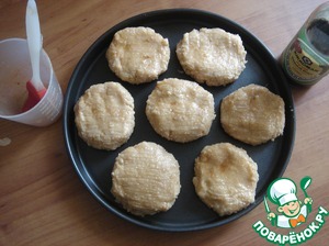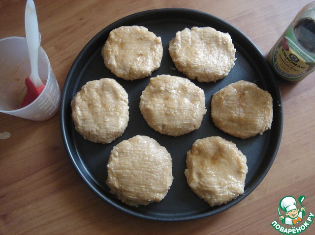 Формируем оладьи. Они отлично формируются. Из этого пюре получилось у меня 12 шт оладий. Выкладываем на противень или как я-на форму для пиццы антипригарную. Выкладываем, оставляя расстояния от оладий. Кисточкой обмазываем верх оладий, оставшимся маслом. Ставим в разогретую духовку до т-180 С на 30 минут. Ориентируйтесь на свою духовку. Оладьи должны подсушиться немного. сверху.