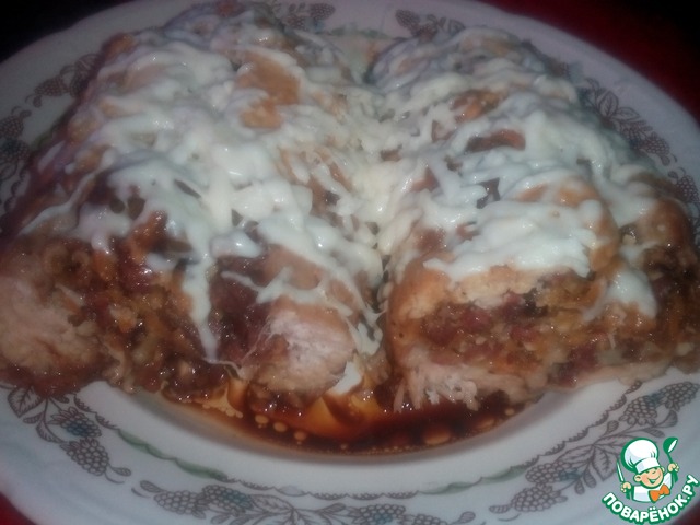 Филе разложить одним пластом и равномерно выложить на него начинку. Я этот шаг как-то пропустила сфоткать.