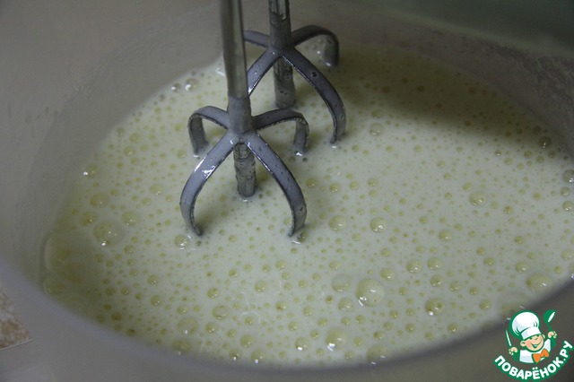 Добавить муку, смешанную с разрыхлителем (просеять!!!).