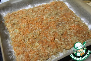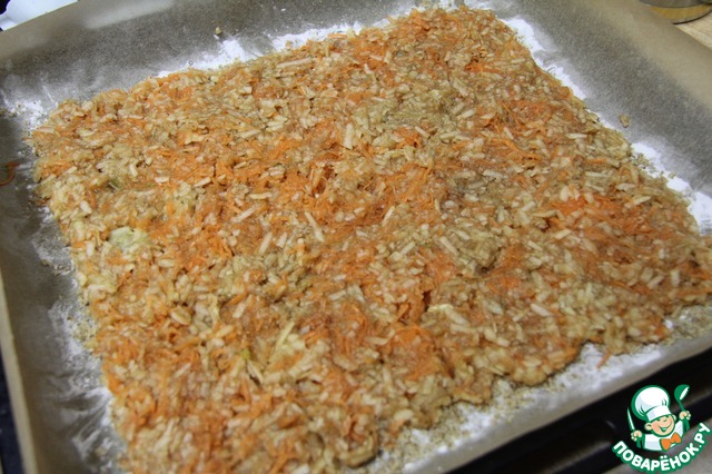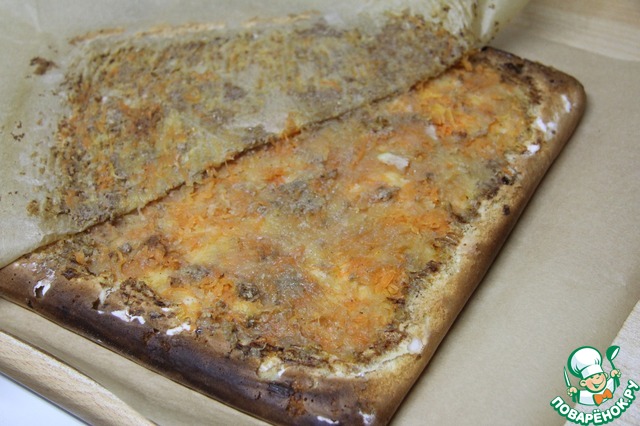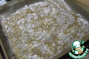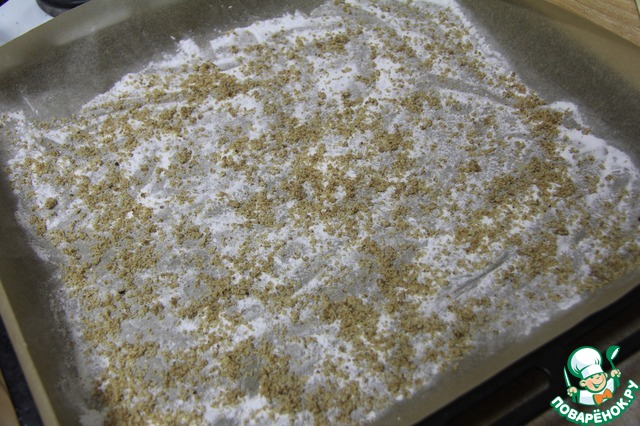 Противень застелить бумагой для выпечки. Бумагу я слегка присыпала крахмалом (по рецепту этого не требовалось) и посыпала молотыми орехами. По опыту теперь скажу: добавьте их в основную массу начинки, а то при выпекании они частично остаются на бумаге.