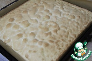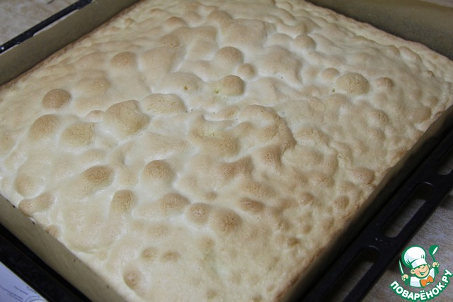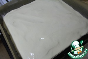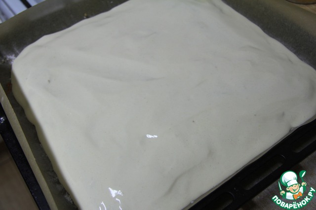 На начинку равномерно вылить тесто и слегка разровнять до одинаковой толщины, придавая форму пласту.