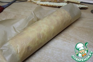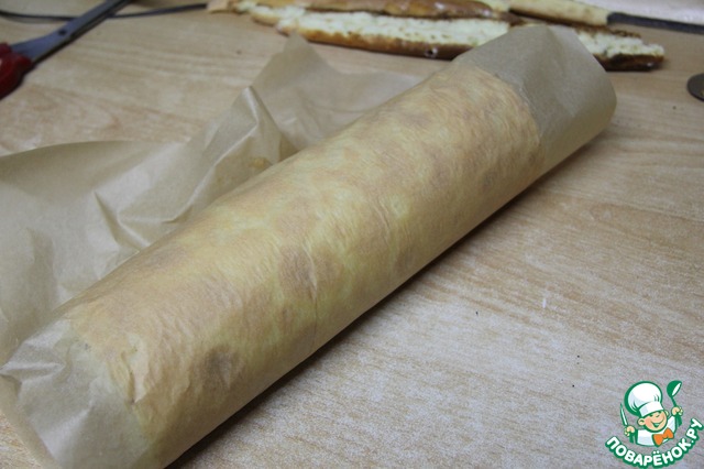 Аккуратно снять бумагу, на которой рулет выпекался. По периметру обрезать сухой краешек, чтобы легко и без разрыва свернуть.