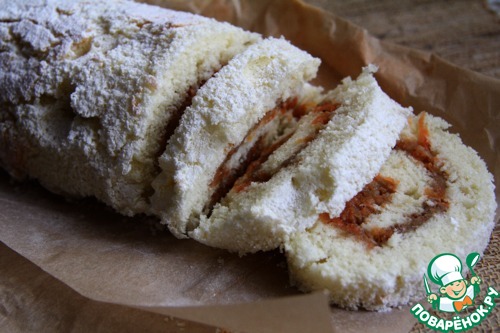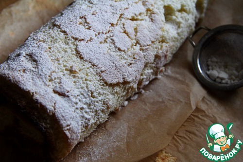 Выложить готовый пласт (перевернув на другой лист бумаги). Не повторите мою невнимательность: я забыла присыпать его сахаром или пудрой, и корочка бисквита прилипла к бумаге, но рулет не стал хуже. Даже наоборот, он стал весь беленьким ;-)