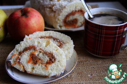 Этот рецепт переводной, поэтому дословного названия я вам не могу сказать, а вот по технологии и составу я решила, что он напоминает "Шарлотку". Отсюда и название. Мне понравилось приготовление этого рулета: начинка выпекается сразу с тестом. Быстро, вкусно, удобно. Рыхлый воздушный бисквит, классика сочетания - яблоко+корица, а еще, морковь и орешки. Вот такой замечательный рулет для выходного дня!!! Мера "стакан" объемом 250мл.
