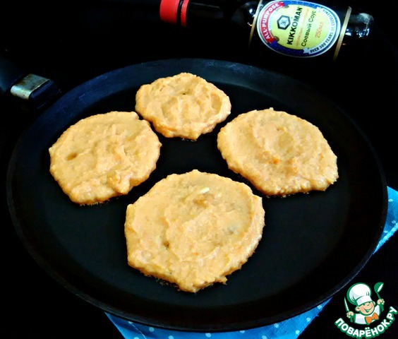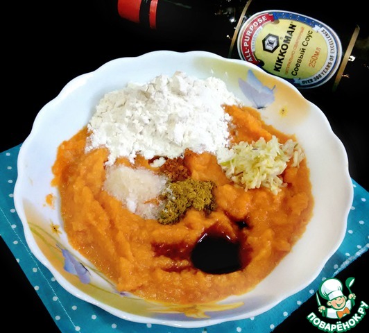 К овощному пюре добавить все специи и приправы, растительное масло, измельченный чеснок, разрыхлитель теста, муку и соевый соус. Я использовала натурально сваренный соевый соус от ТМ Kikkoman.