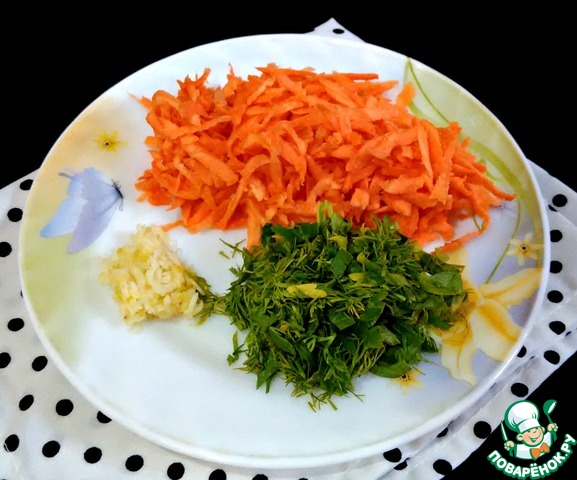 • Морковь натереть на крупной терке. Чеснок измельчить любым удобным для Вас способом (я натерла на мелкой терке). Зелень мелко порезать.