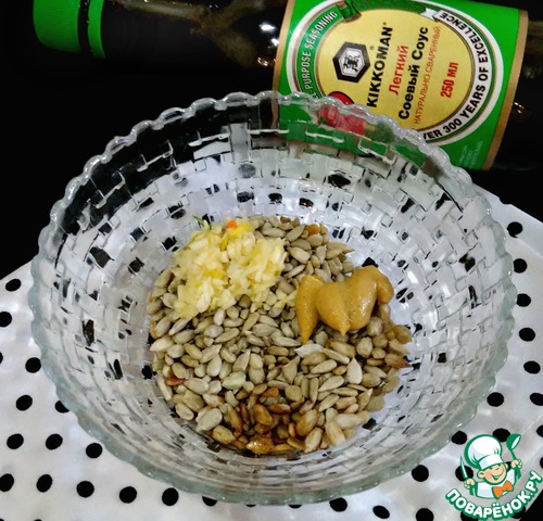 К семечкам подсолнуха добавить измельченный чеснок, горчицу, лимонный сок, соль и соевый соус. Я использовала натурально сваренный, легкий соевый соус от ТМ Kikkoman.