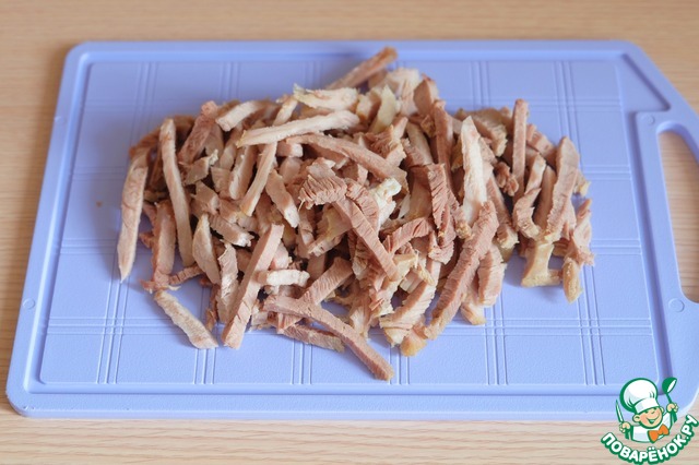 Мясо (свинину или говядину) отварить, порезать тонкими брусочками.