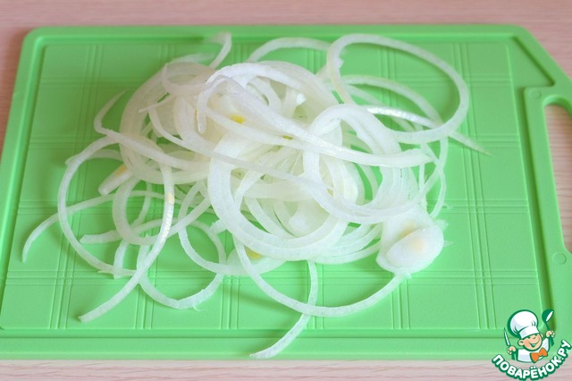 Репчатый лук порезать кольцами - полукольцами. Лук замариновать. Рецепт маринада:http://www. povarenok.ru/recipes /show/139872/