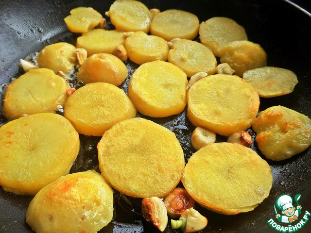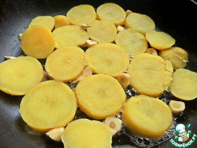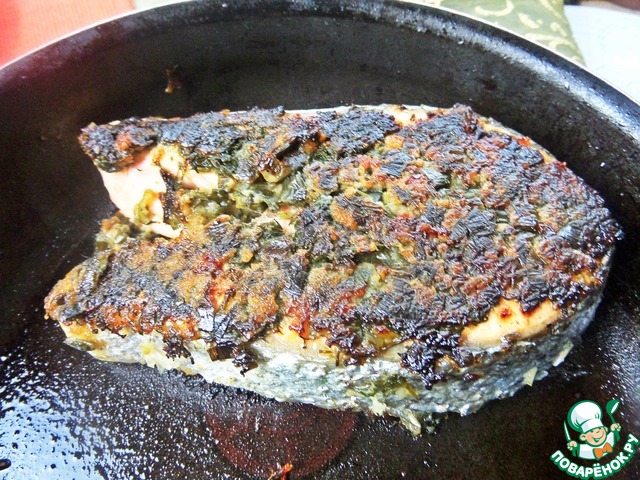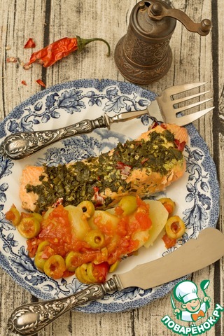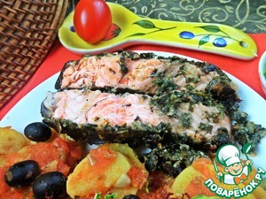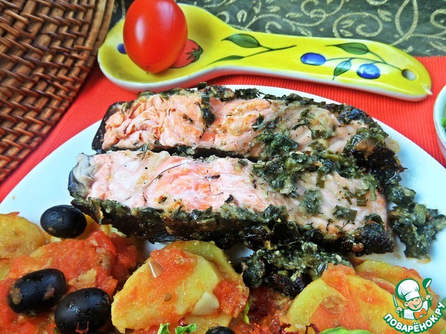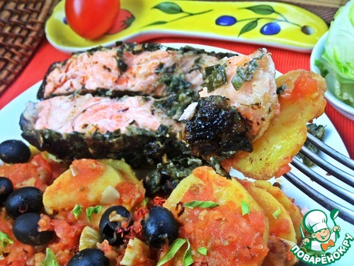 Любителям картошечки понравится данное блюдо. Картошка здесь и правда очень вкусная, идёт как самостоятельный ужин или как гарнир, например, к рыбке. Рецепт от Ю. Высоцкой. У неё рыба в зелёной "шубке" запекалась, я решила обжарить по-быстрому, получилась вкусная корочка.