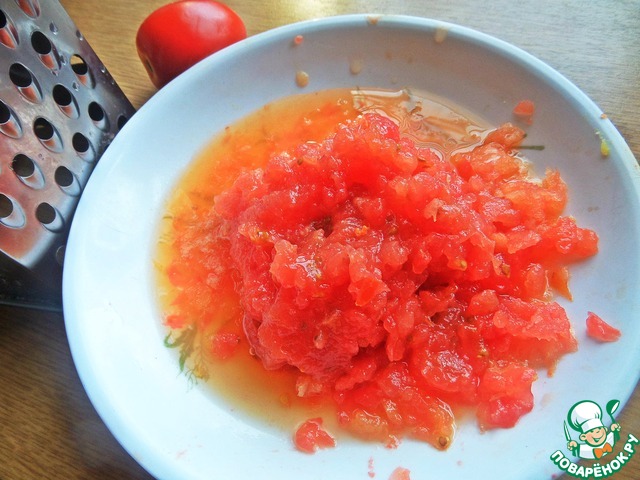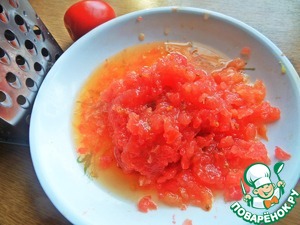 Помидоры надрезать, залить кипятком и снять с них кожицу. Натереть на тёрке. Или используйте готовые протёртые томаты.